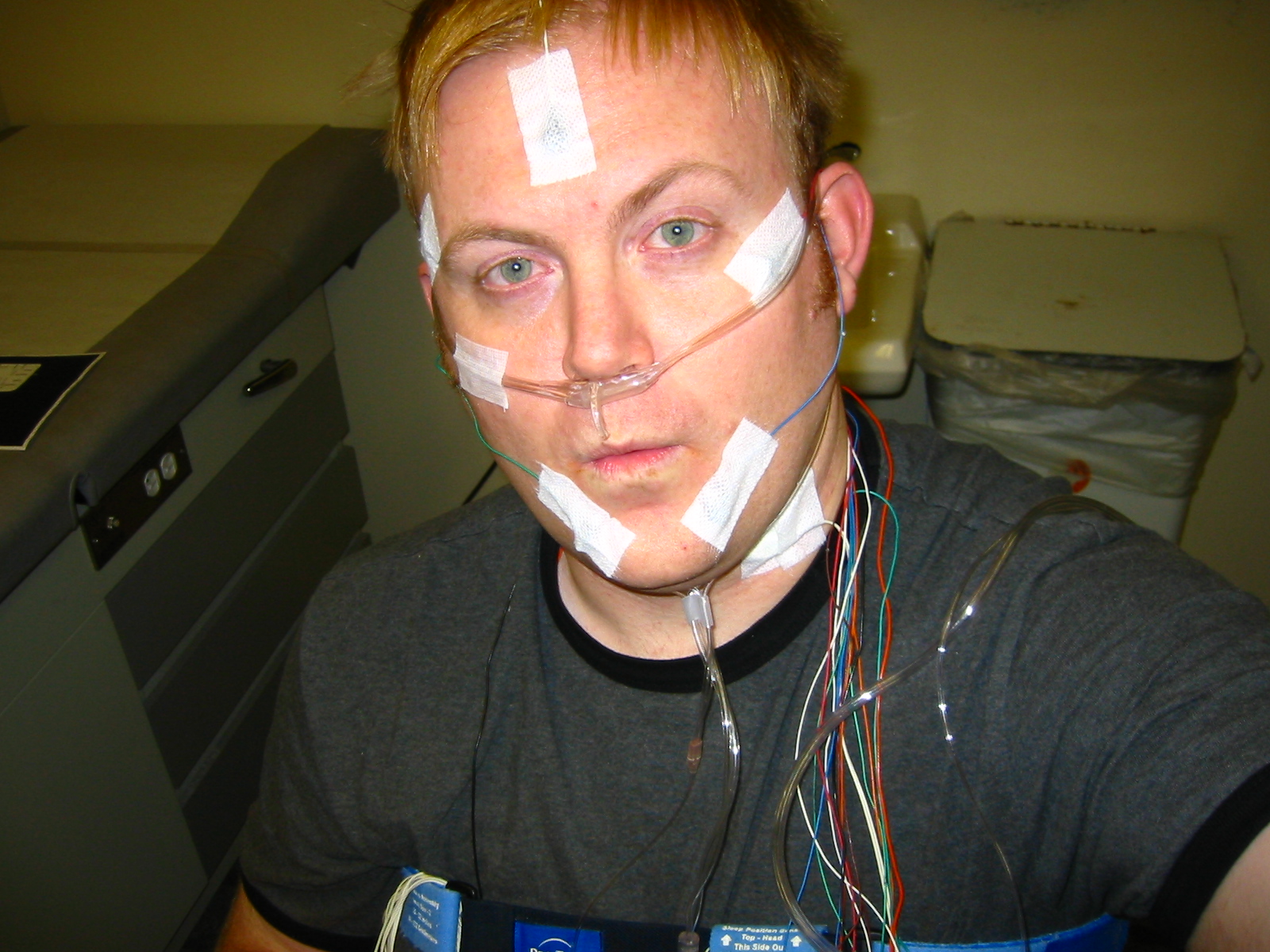 lab with an oxygen saturation monitor on your finger, with a chest monitor to show chest rise, monitors on feet to show leg movements—nothing invasive, but lots of equipment. After a night’s sleep the patient goes home (or work) and the tests results are evaluated.
